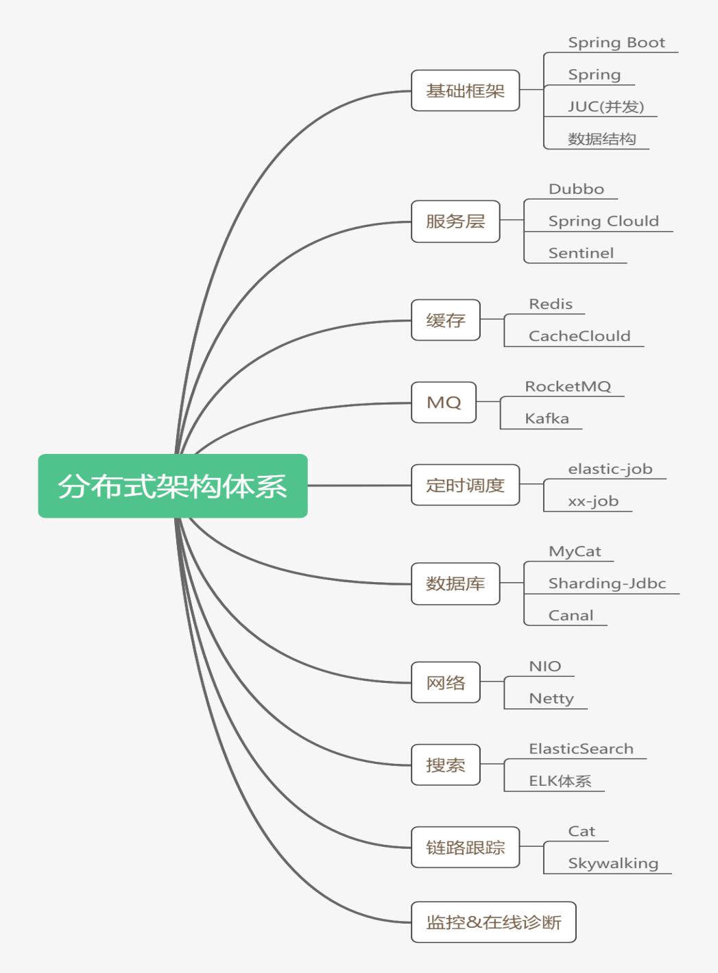 通过对互联网分布式架构的研究,我将突破的方向放在了“中间件领域”,因为我发现整个分布式架构体系离不开各种各样的中间件支撑,如果成体系掌握好这些中间件,就能轻松驾驭分布式架构,技能也将得到质的提升,个人总结的分布式架构体系大概如下图所示: